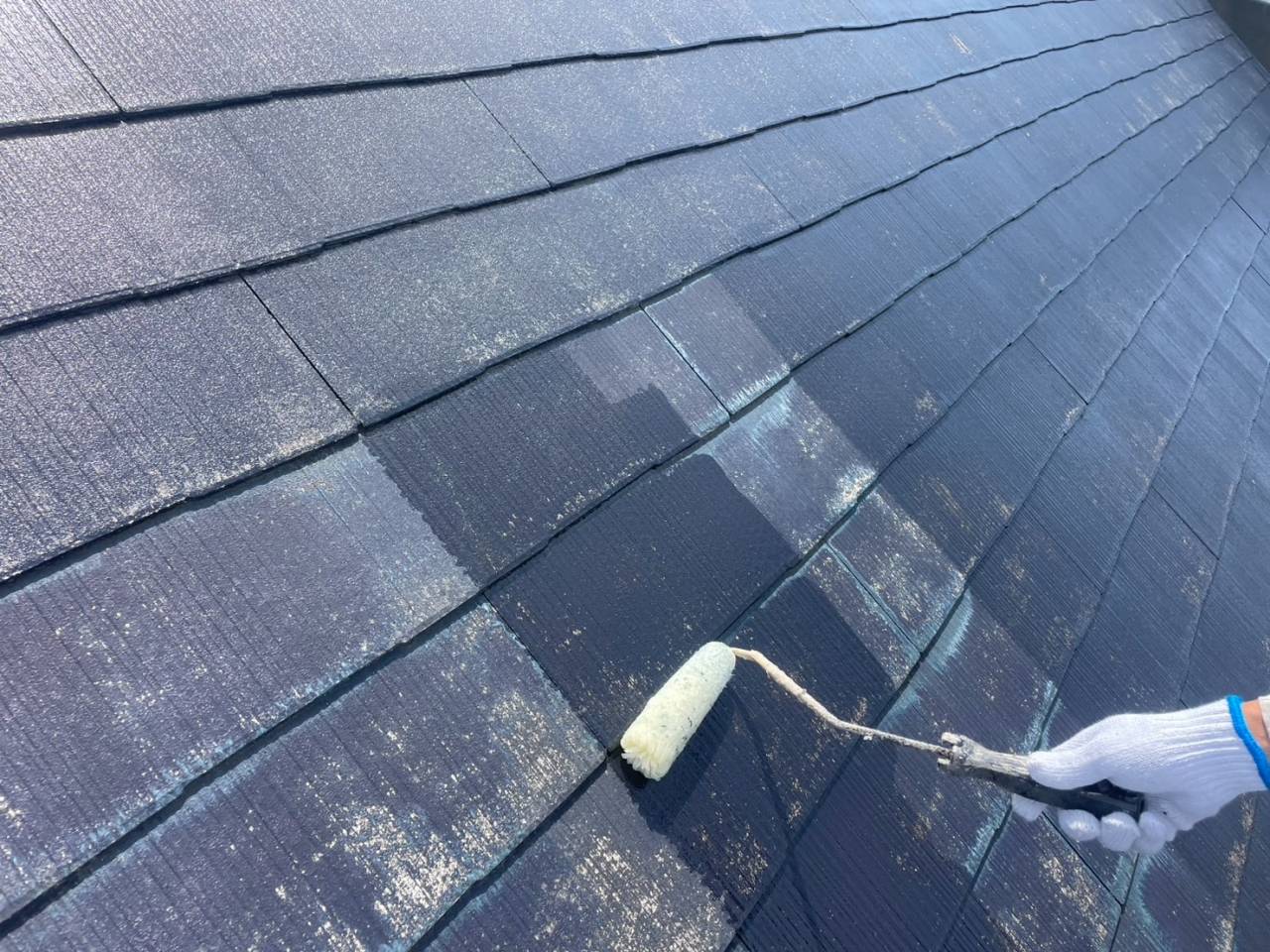 横浜市のN様邸、屋根塗装・付帯部塗装工事、本日の作業内容は屋根中塗りです。