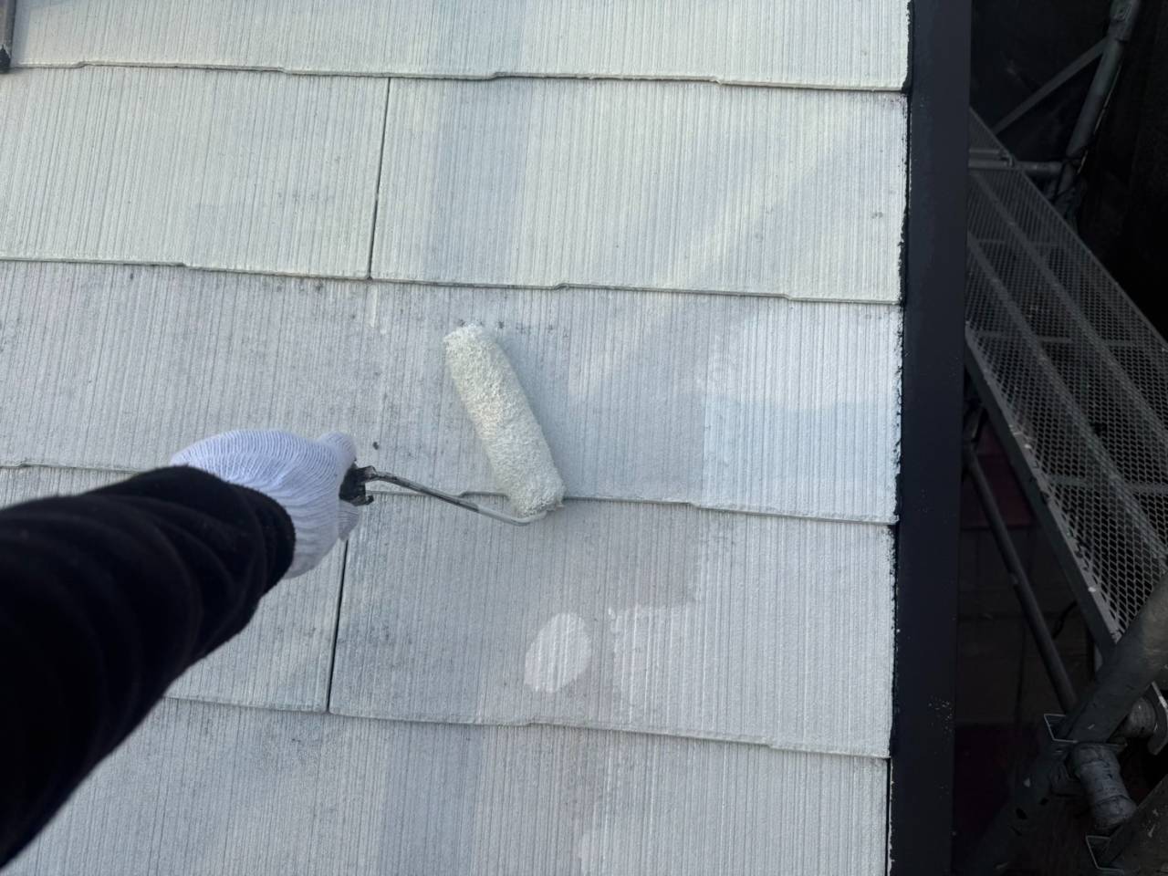 相模原市のY様邸、外壁塗装・屋根塗装工事、本日の作業内容は外壁中塗り、屋根中塗り、外壁一面上塗りです。