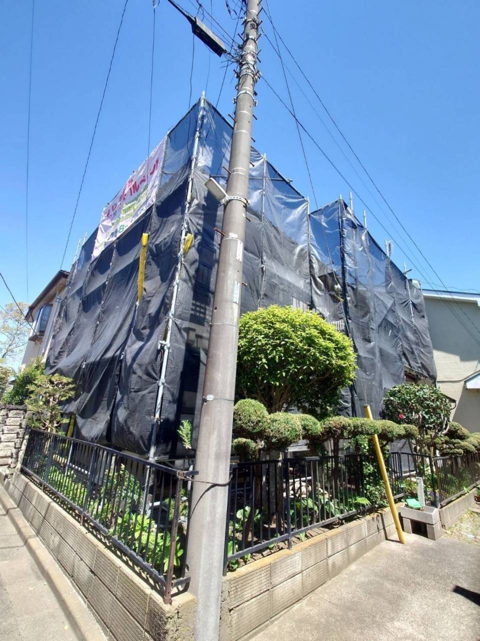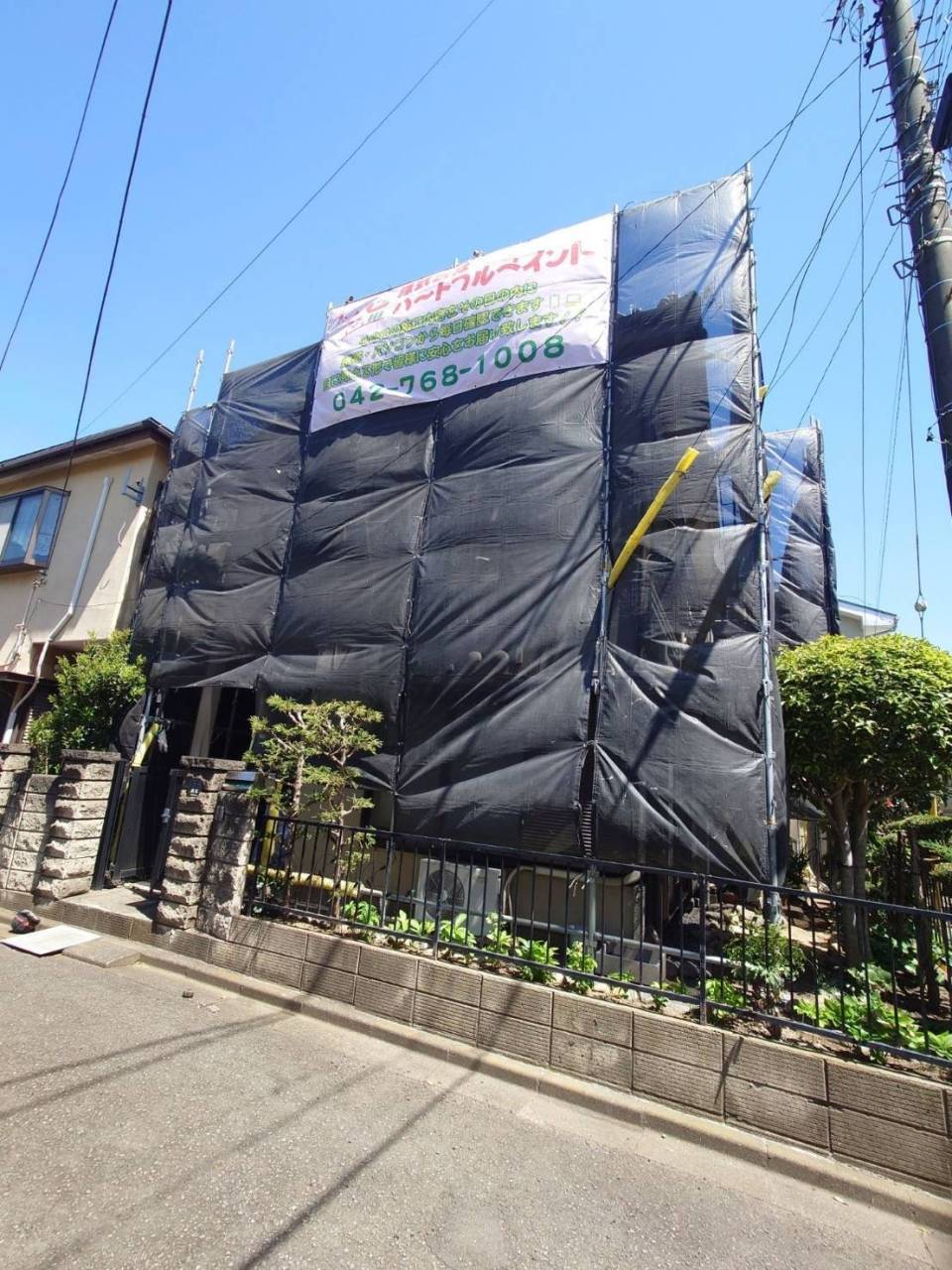 座間市のO様邸、外壁塗装工事、昨日の作業内容は足場の組立です。