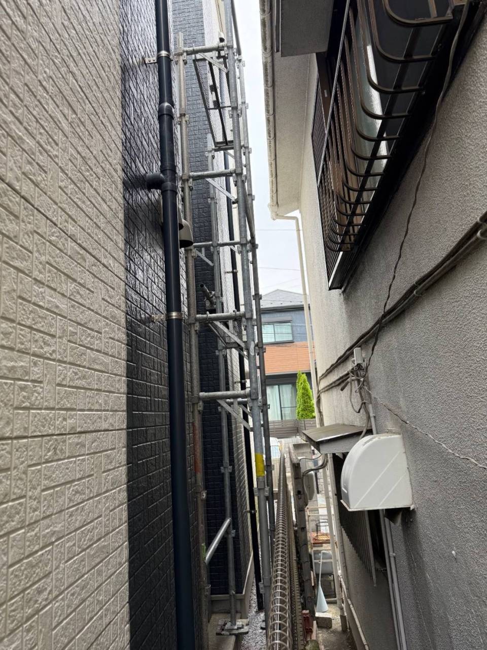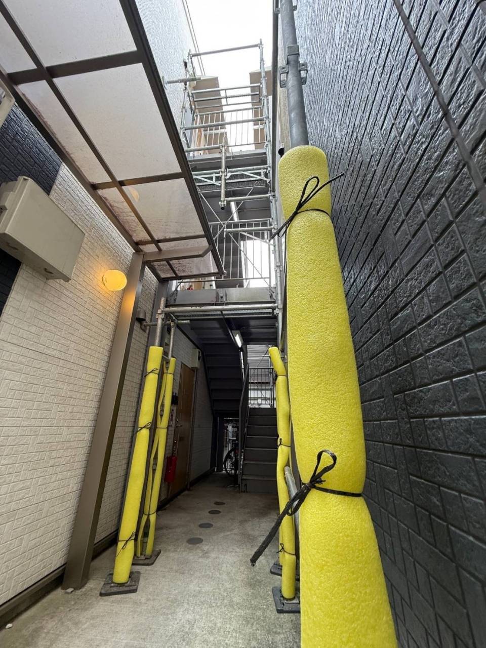 横浜市のF様RK集合住宅、鉄階段塗装工事、本日の作業内容は部分足場掛けです。