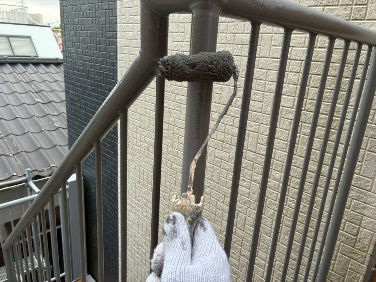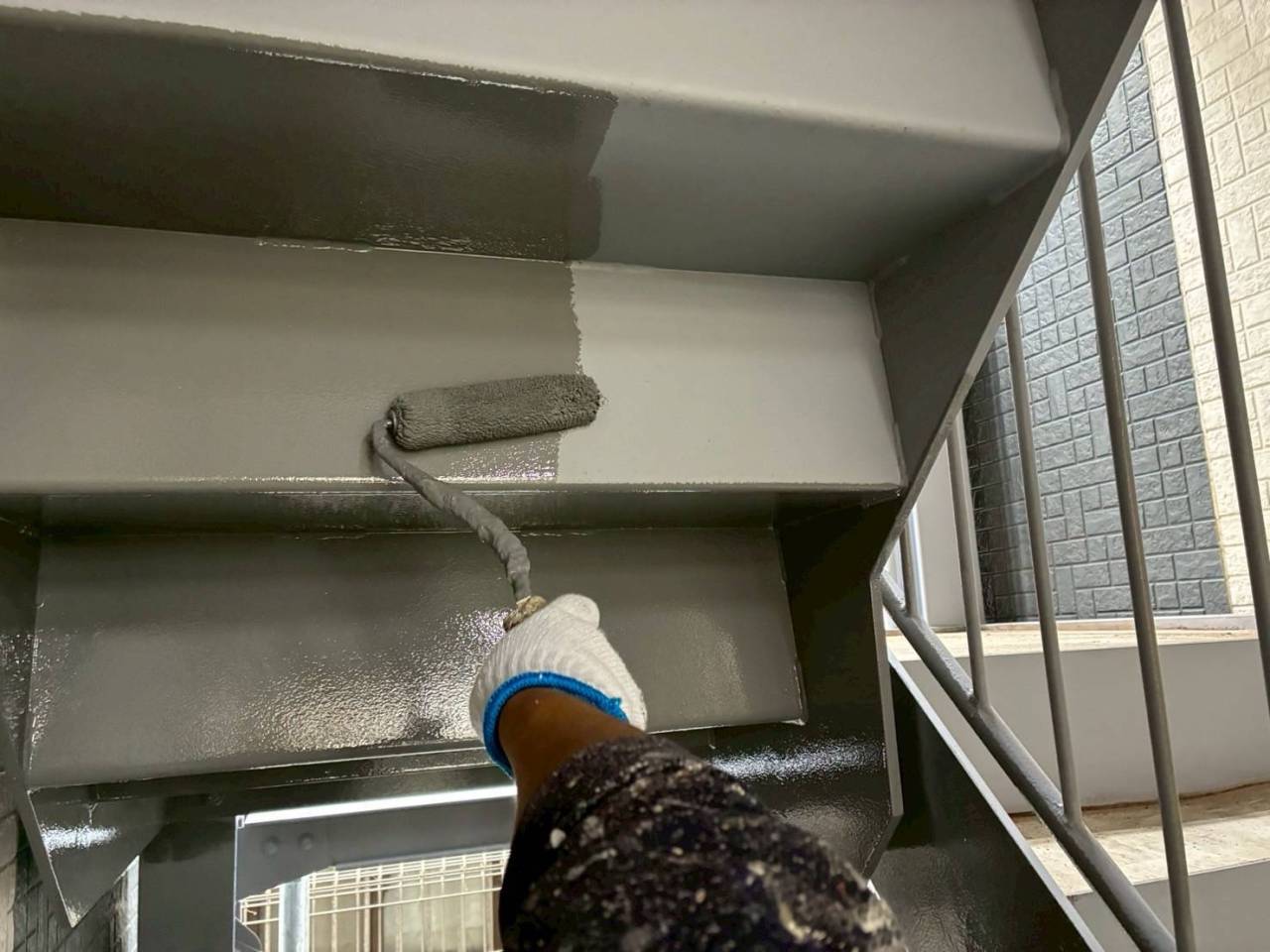 横浜市のF様RK集合住宅、鉄階段塗装工事、本日の作業内容は鉄骨中塗りです。
