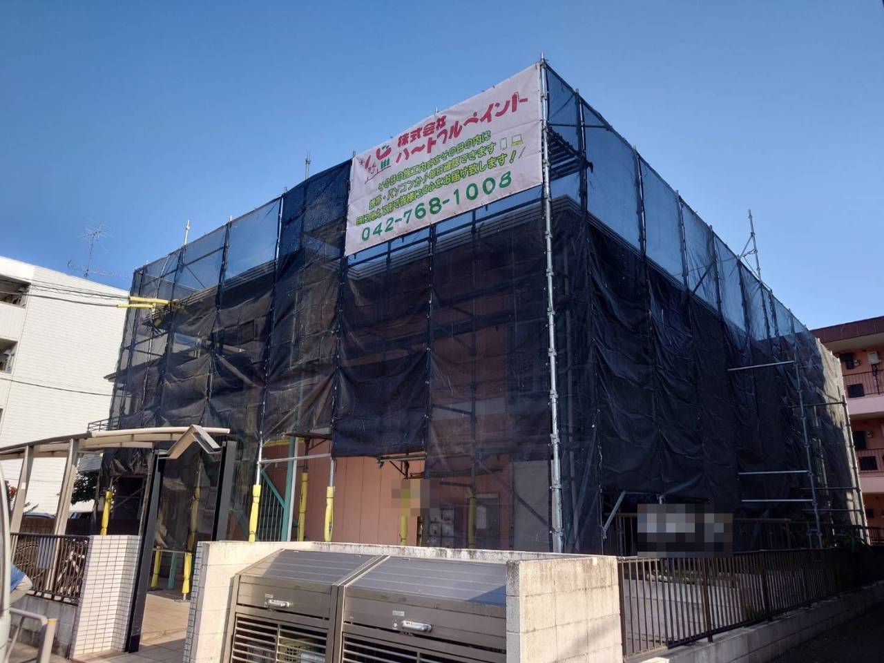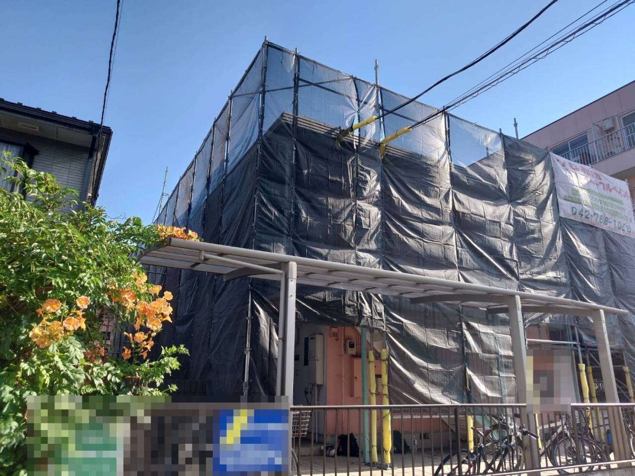 八王子市のI様F・H集合住宅、外壁リフレッシュ工事、本日の作業内容は足場の組立です。
