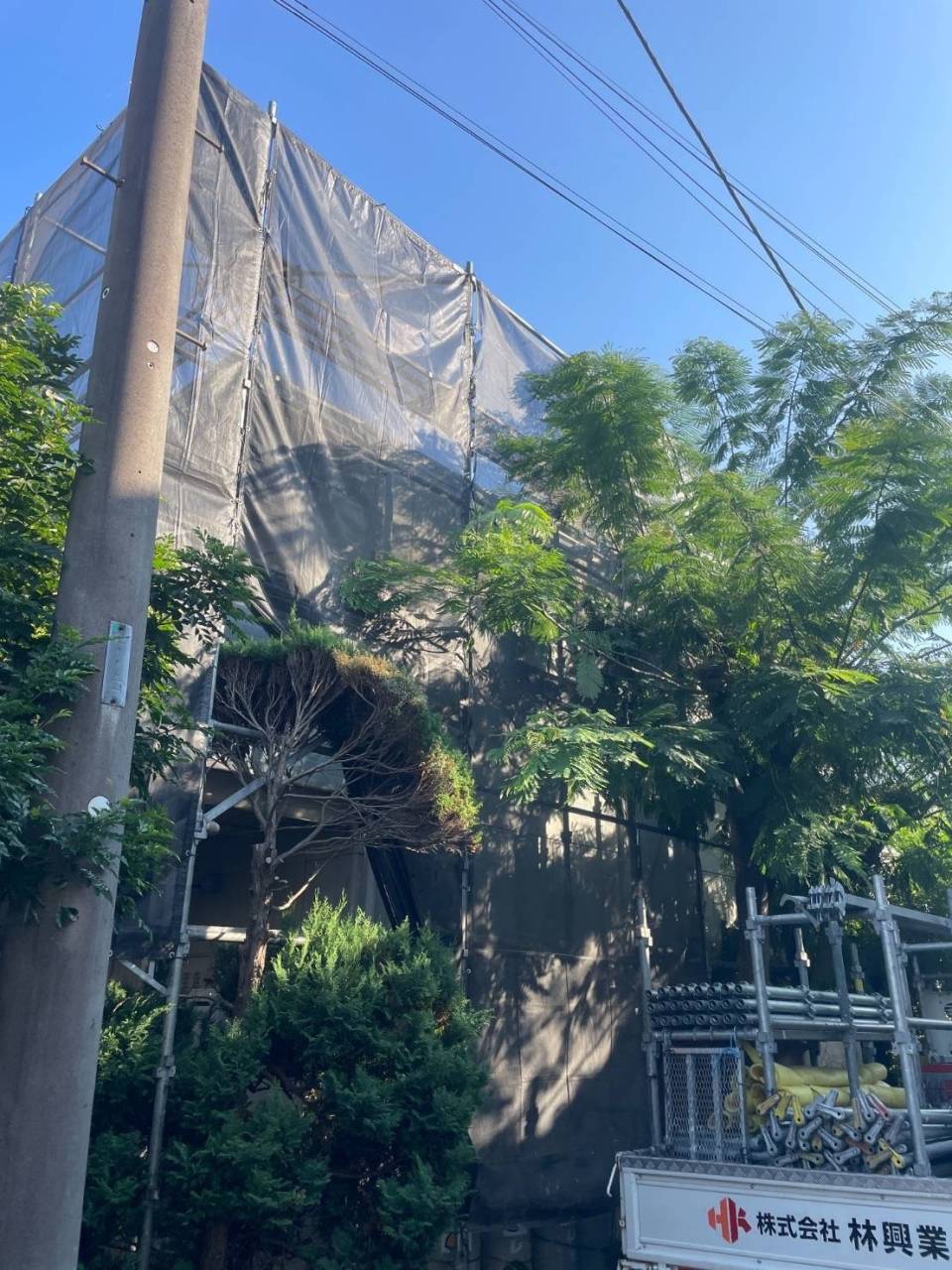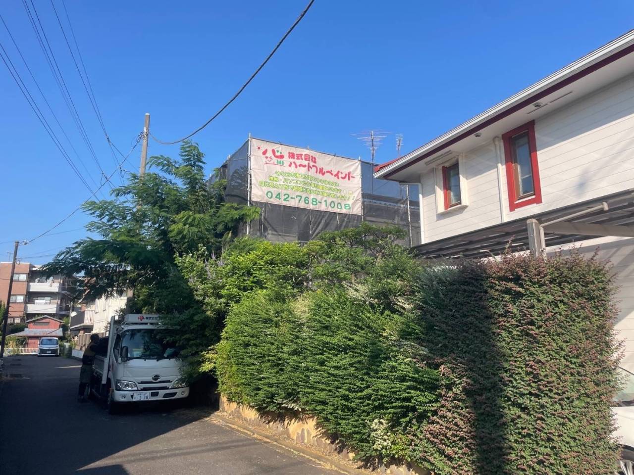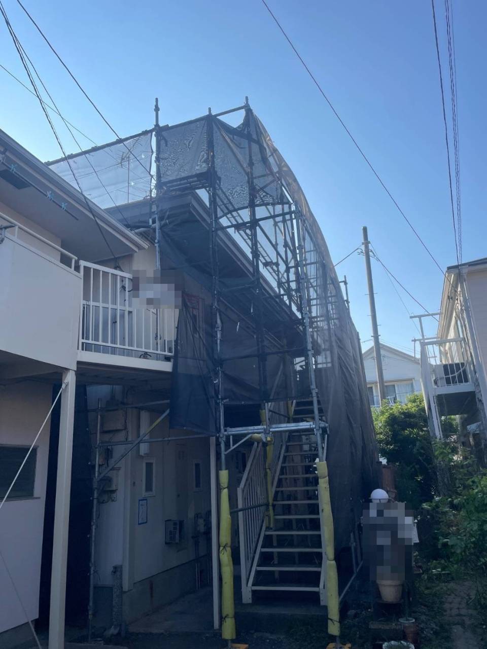 町田市のS様S・H集合住宅、外装リフレッシュ工事、本日の作業内容は足場の組立です。