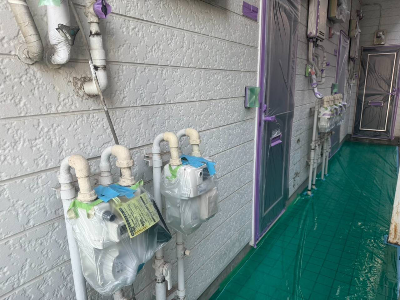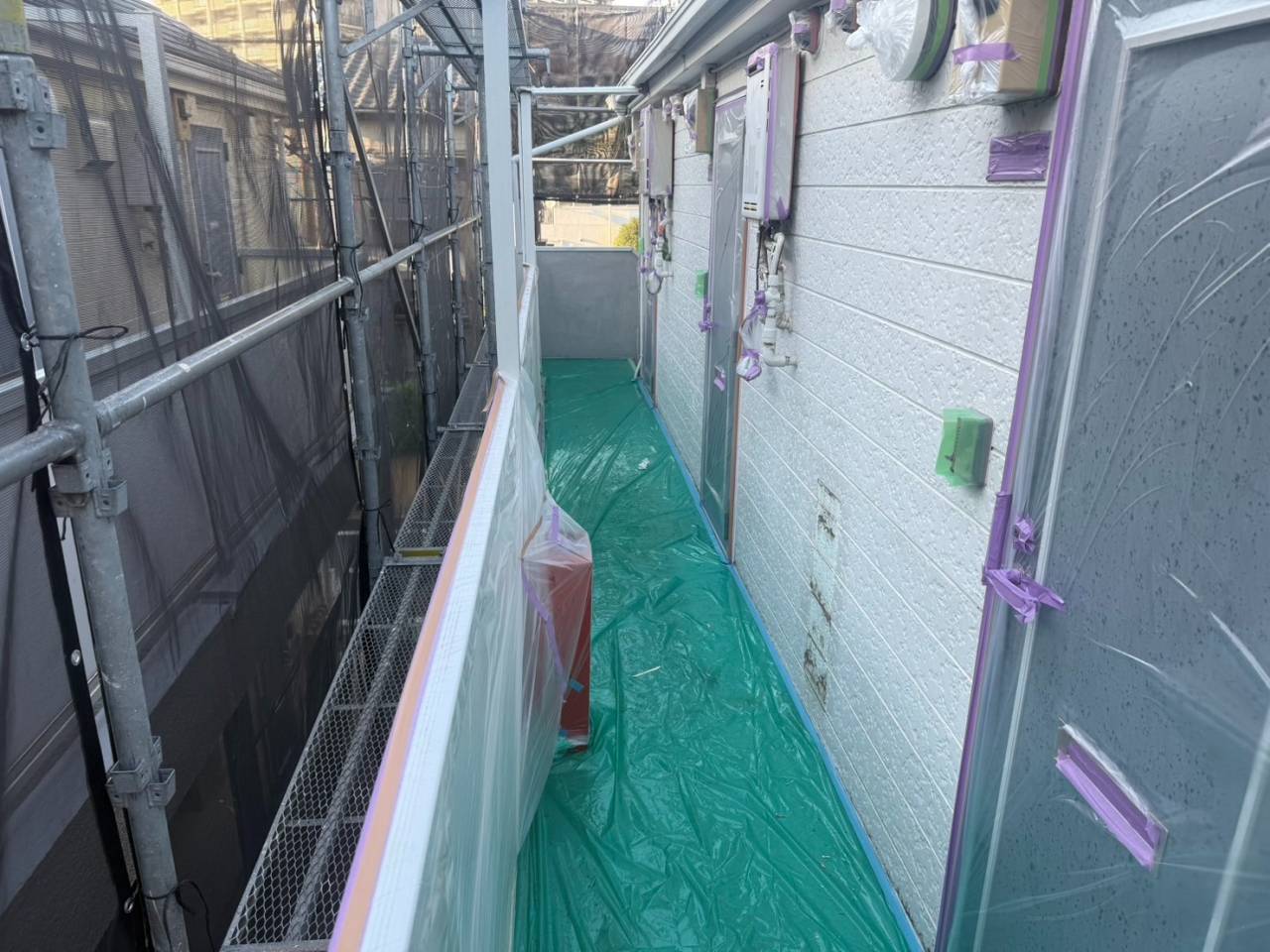 杉並区のI様C・I集合住宅、外壁リフレッシュ工事、昨日の作業内容は破風板シール、養生です。