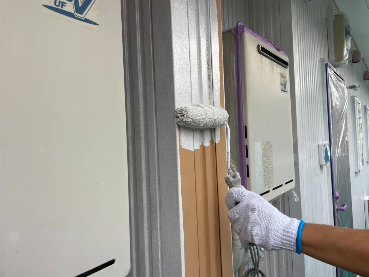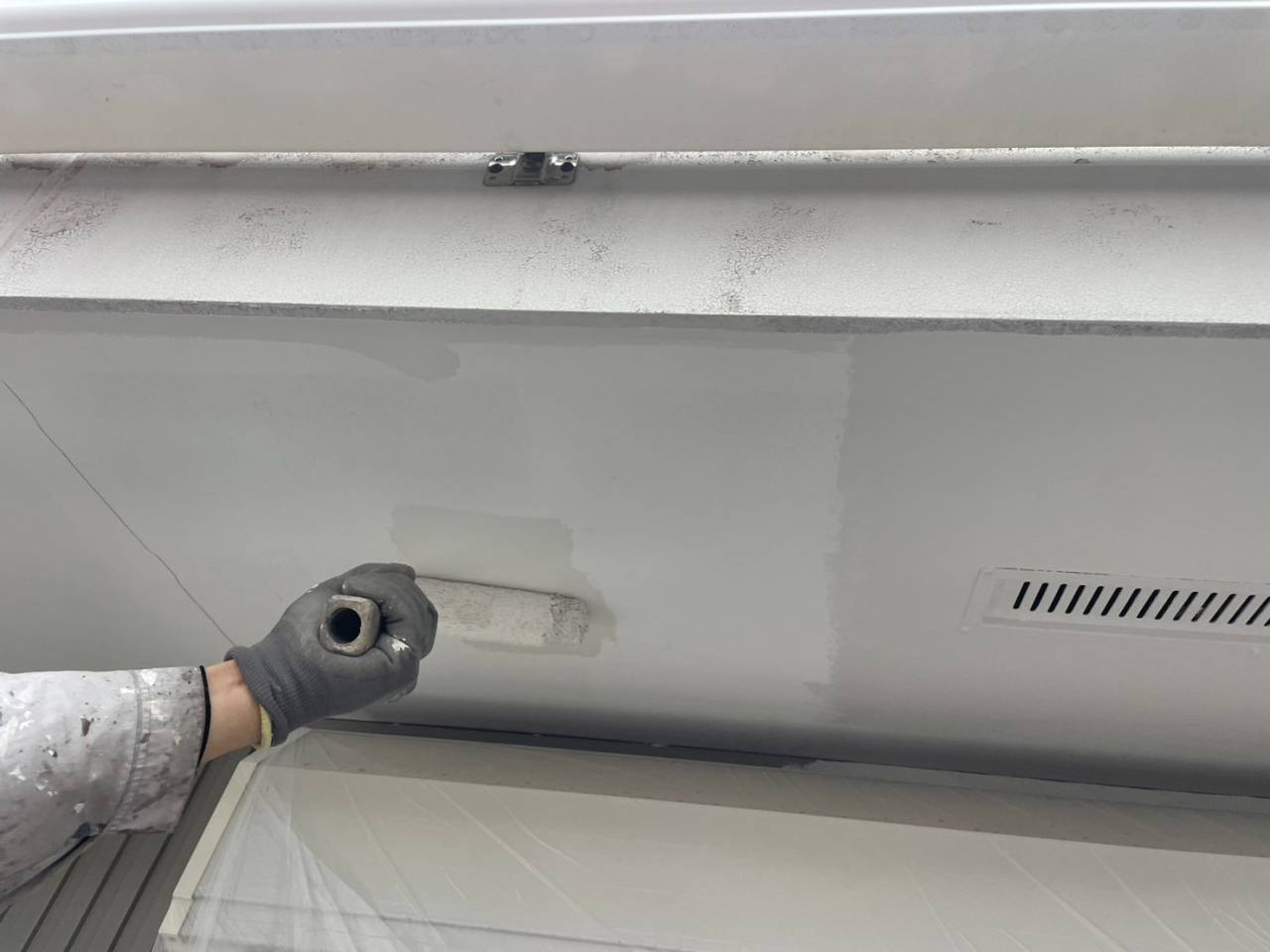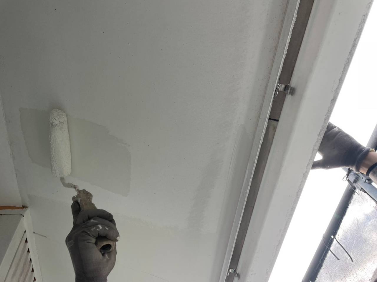 養生続き、軒天塗装、外壁下塗りです。