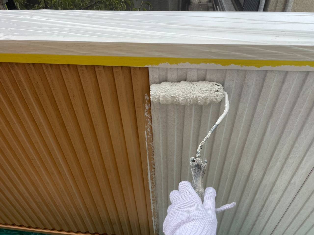 相模原市のS様C・I・M集合住宅、外壁リフレッシュ工事、本日の作業内容は養生続き、軒天塗装、外壁下塗りです。