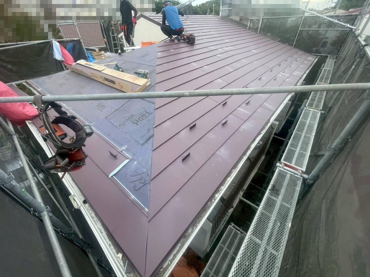 八王子市のK様邸、屋根葺き替え工事、本日の作業内容はケラバ板金取付け、大屋根本体取付けです。