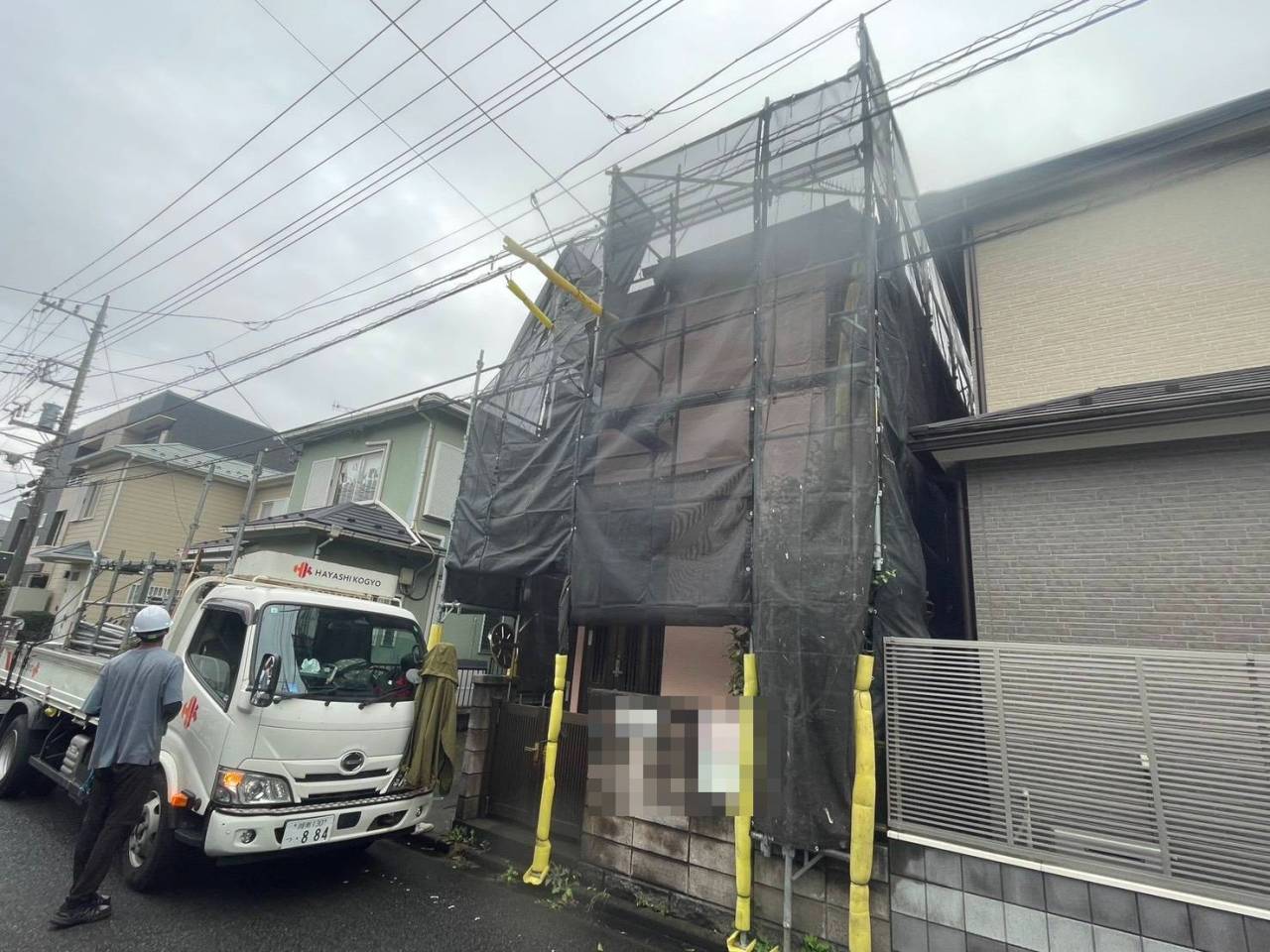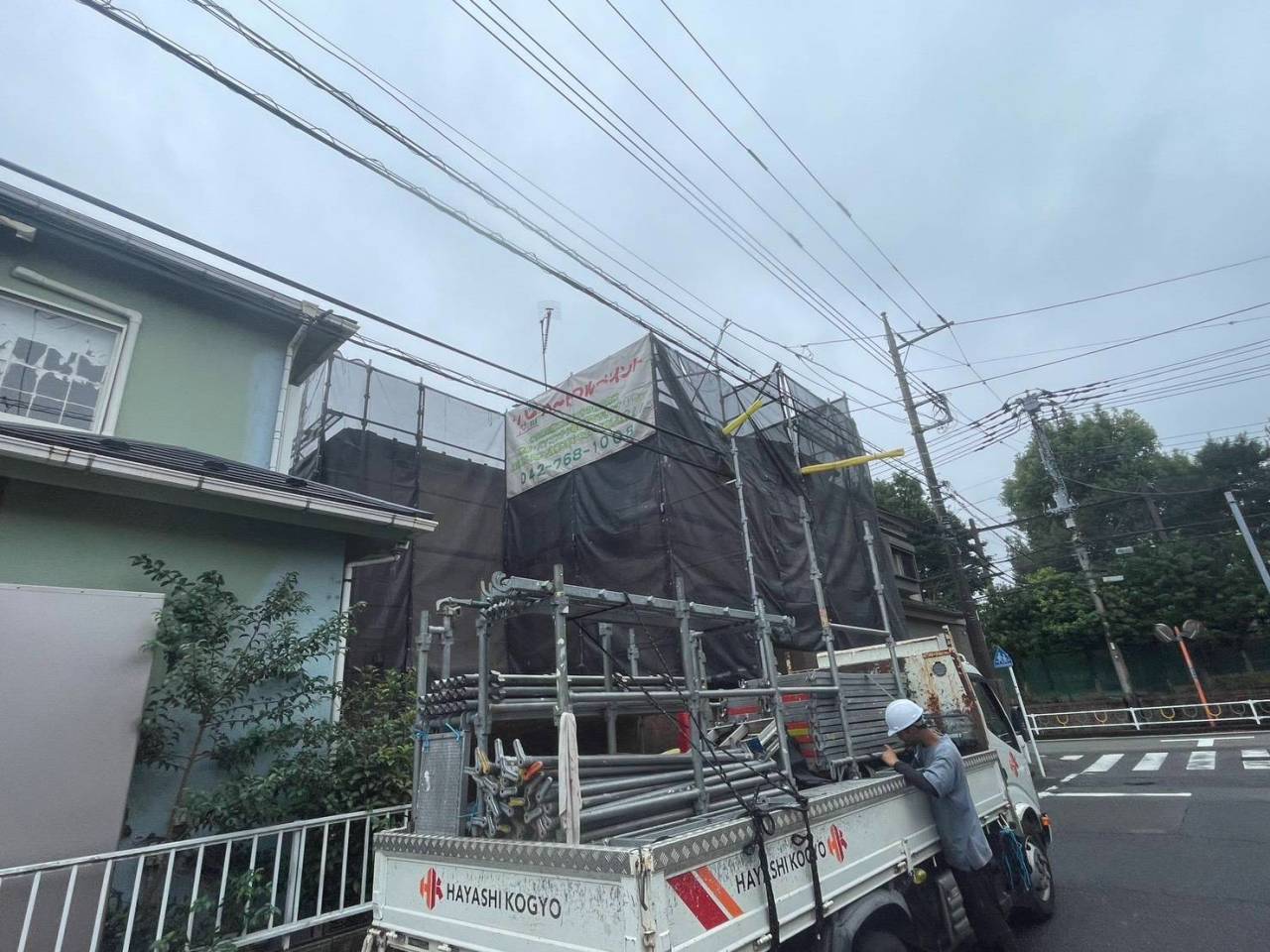 相模原市のK様物件、外壁塗装・屋根塗装工事、本日の作業内容は足場の組立です。