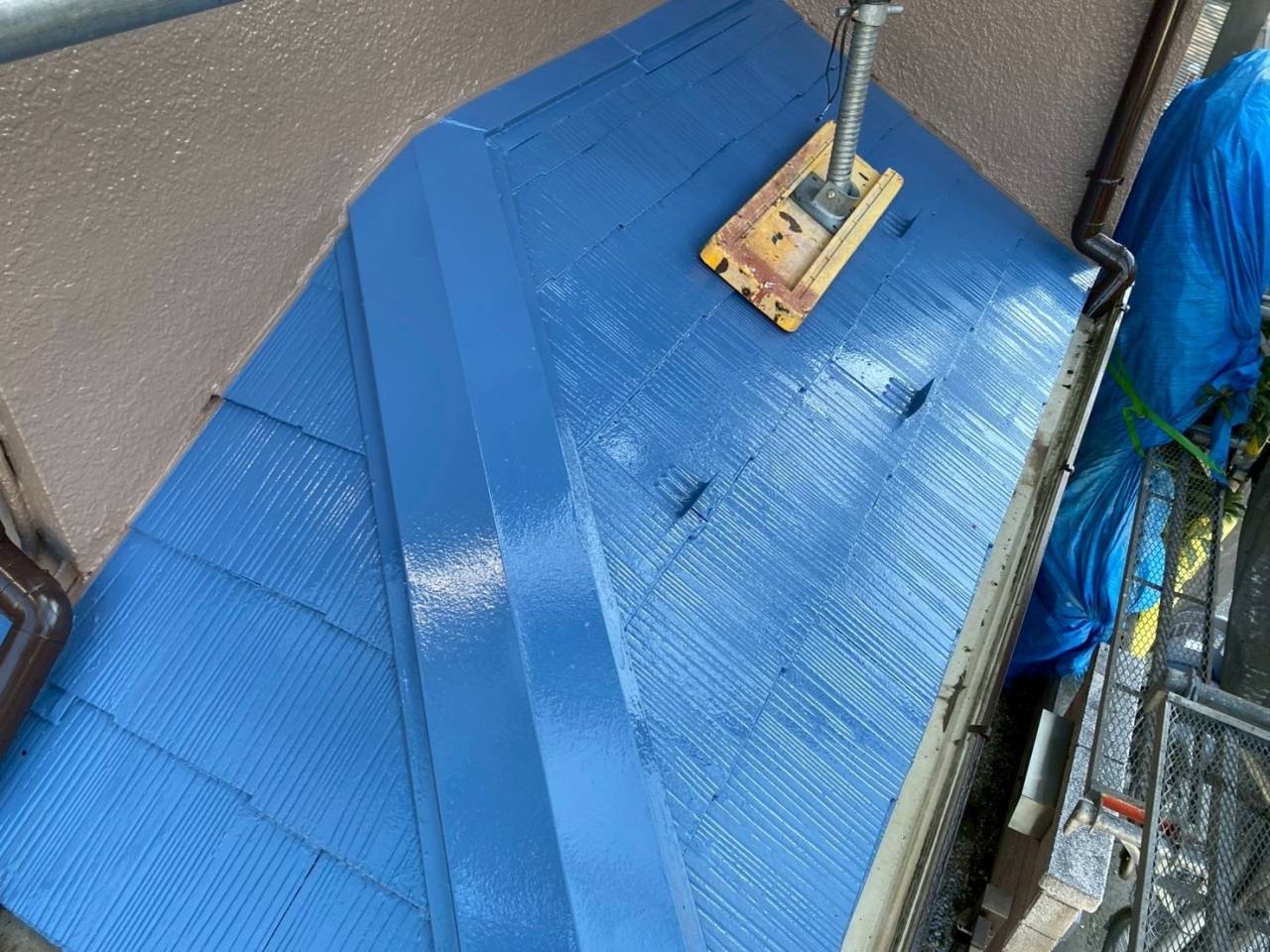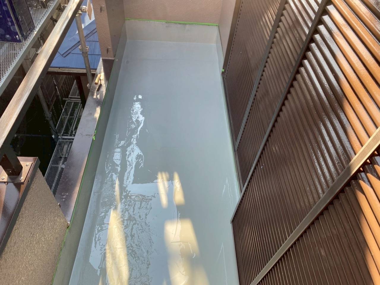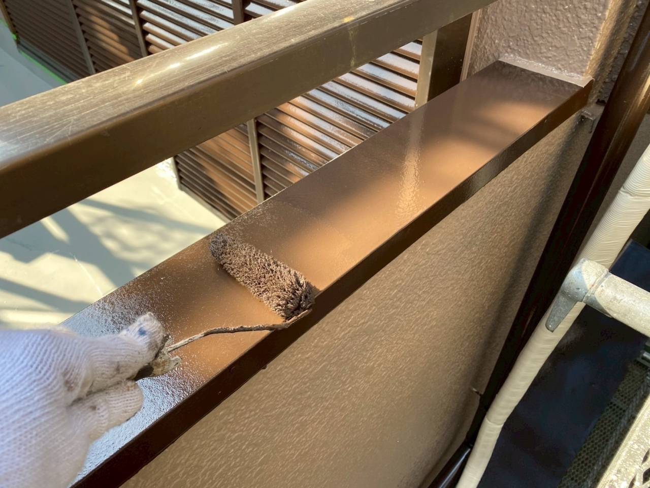 相模原市のK様物件、外壁塗装・屋根塗装工事、本日の作業内容はベランダウレタン防水二層目塗布、エアコン配管ホーステープ巻き、掃除、タッチアップです。