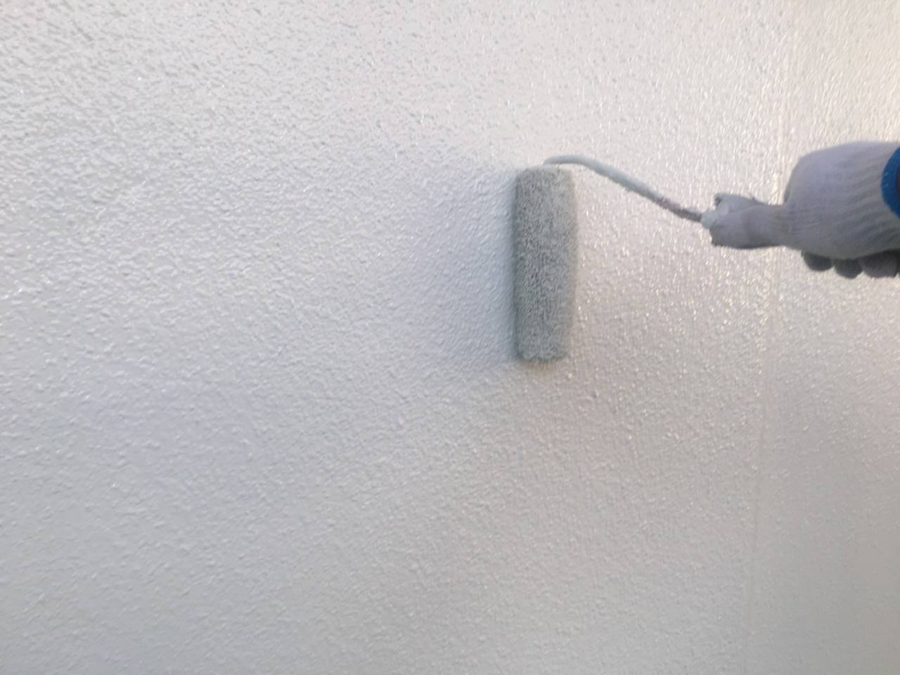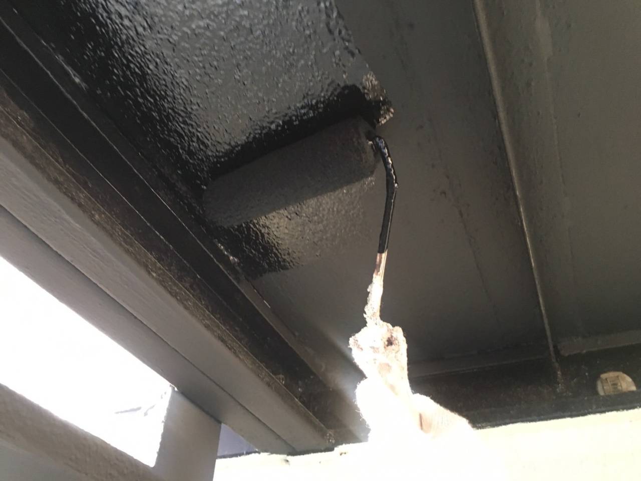 相模原市のN様UN社屋、外壁塗装・屋根塗装工事、本日の作業内容は通路面外壁中塗り続き・上塗り、鉄部中塗りです。
