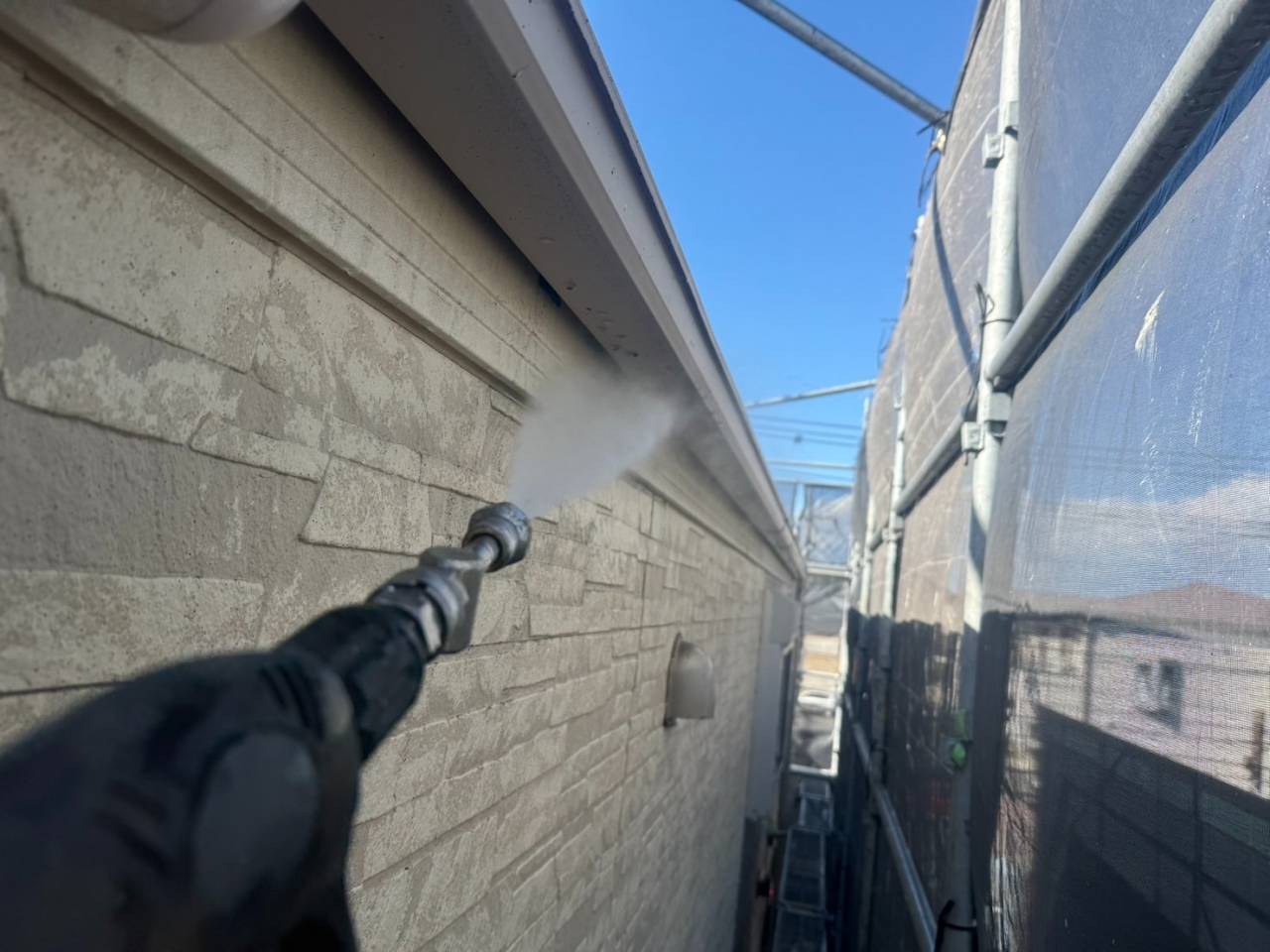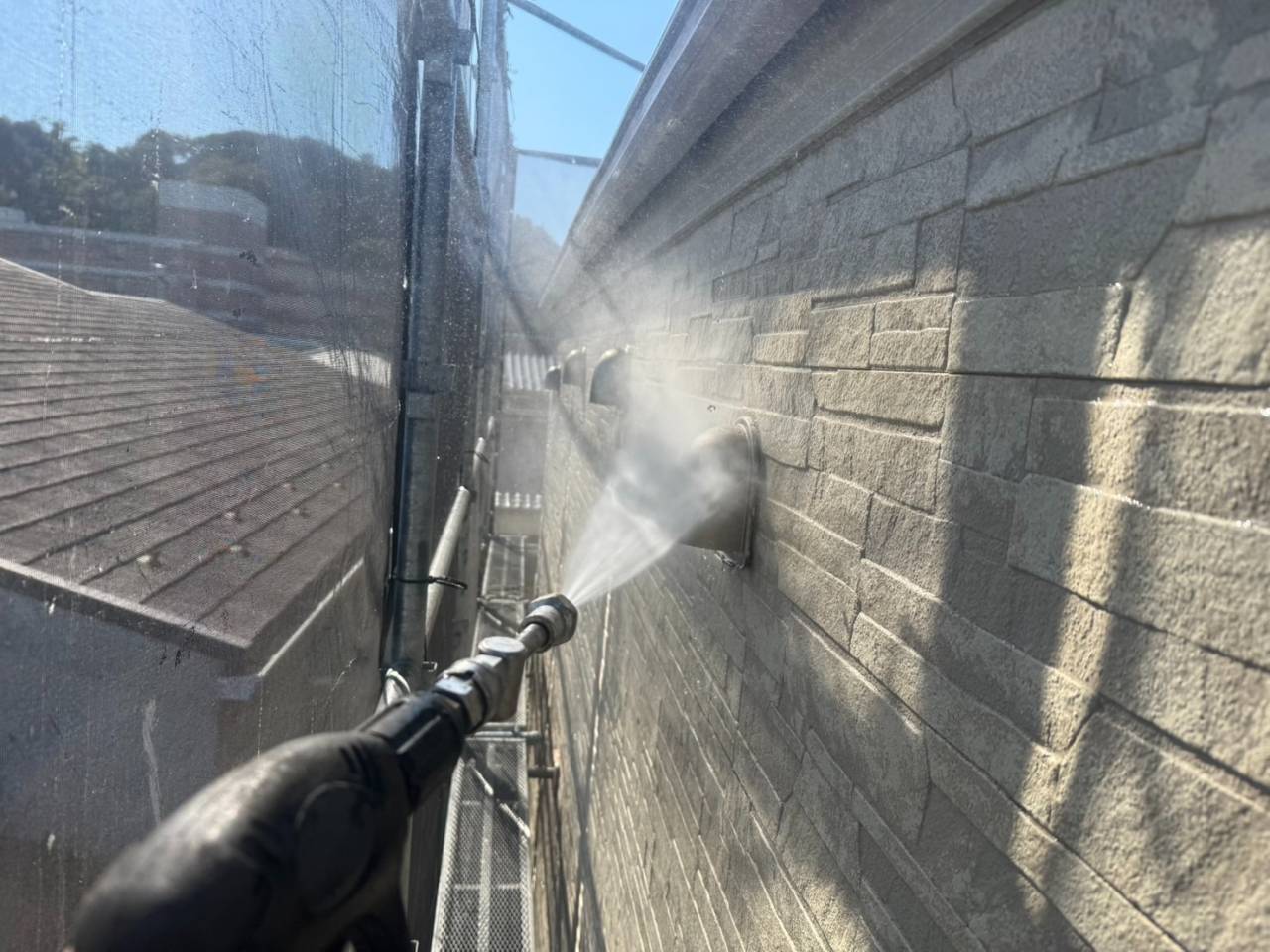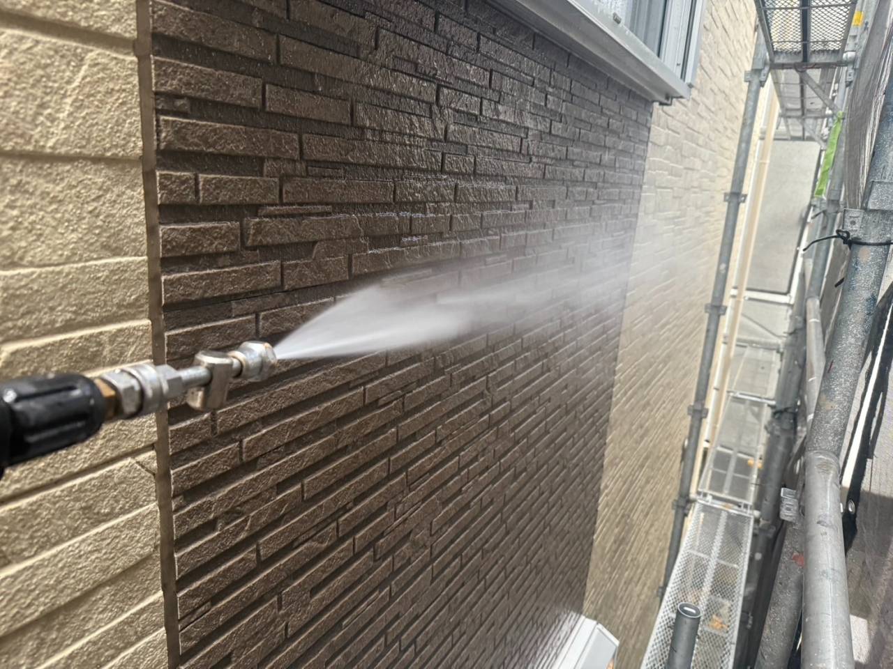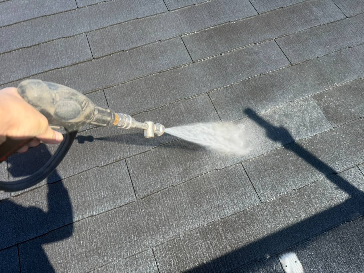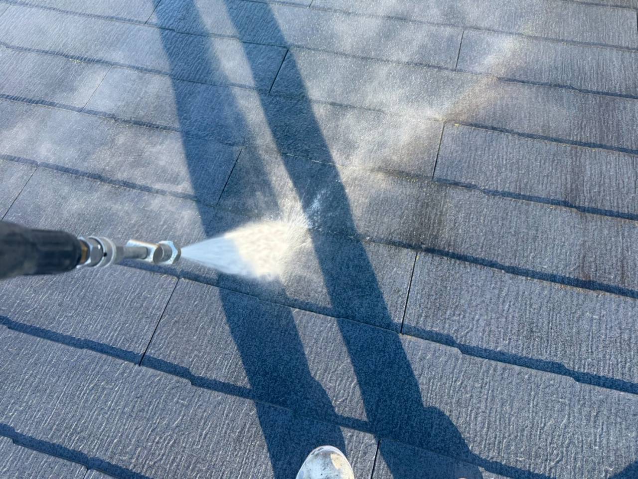 本日は業務用高圧洗浄機を使用し、外壁・屋根の汚れやカビ、チョーキングの粉をしっかりと洗い流しました。