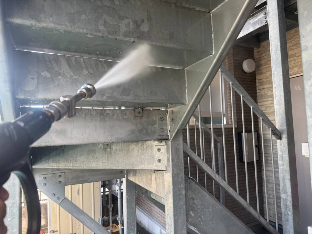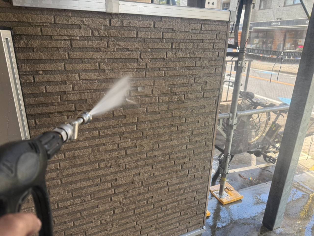 川崎市のF様A・S集合住宅、外装リフレッシュ工事、本日の作業内容は高圧水洗浄です。