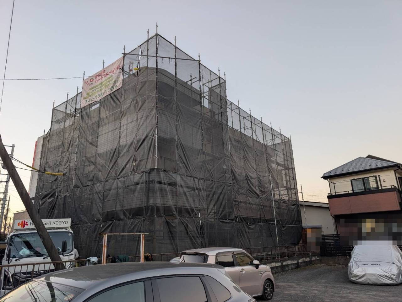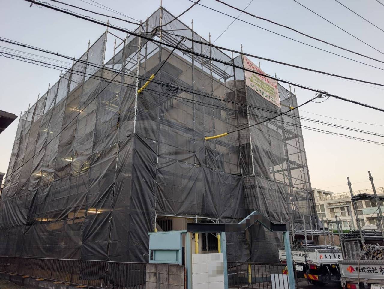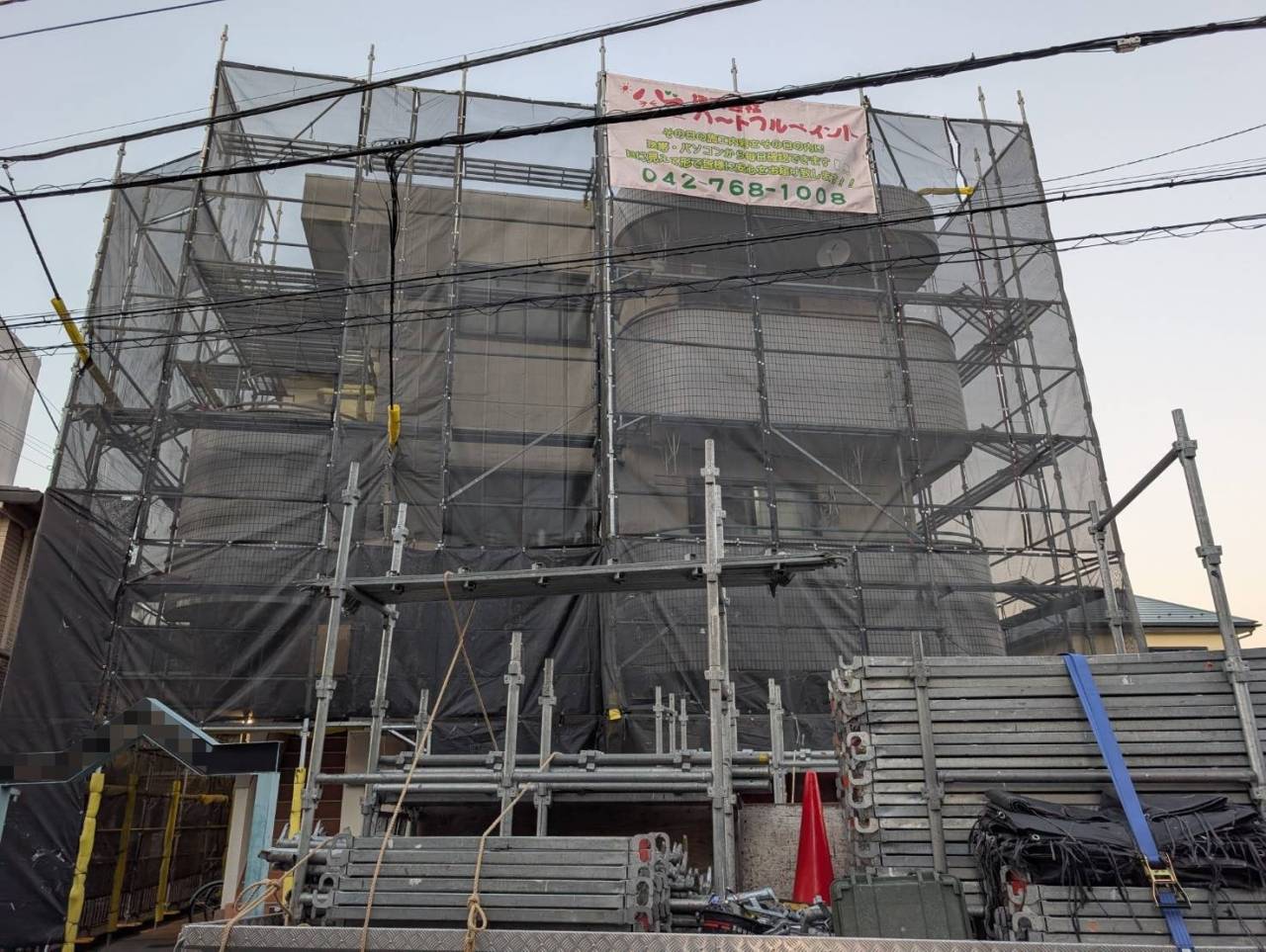 相模原市のY様M・F集合住宅、外装リフレッシュ工事、本日の作業内容は足場の組立です。