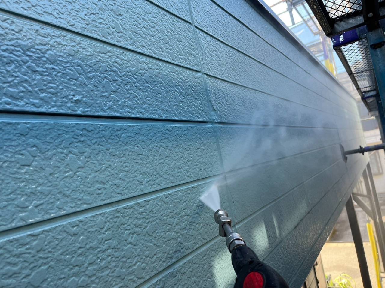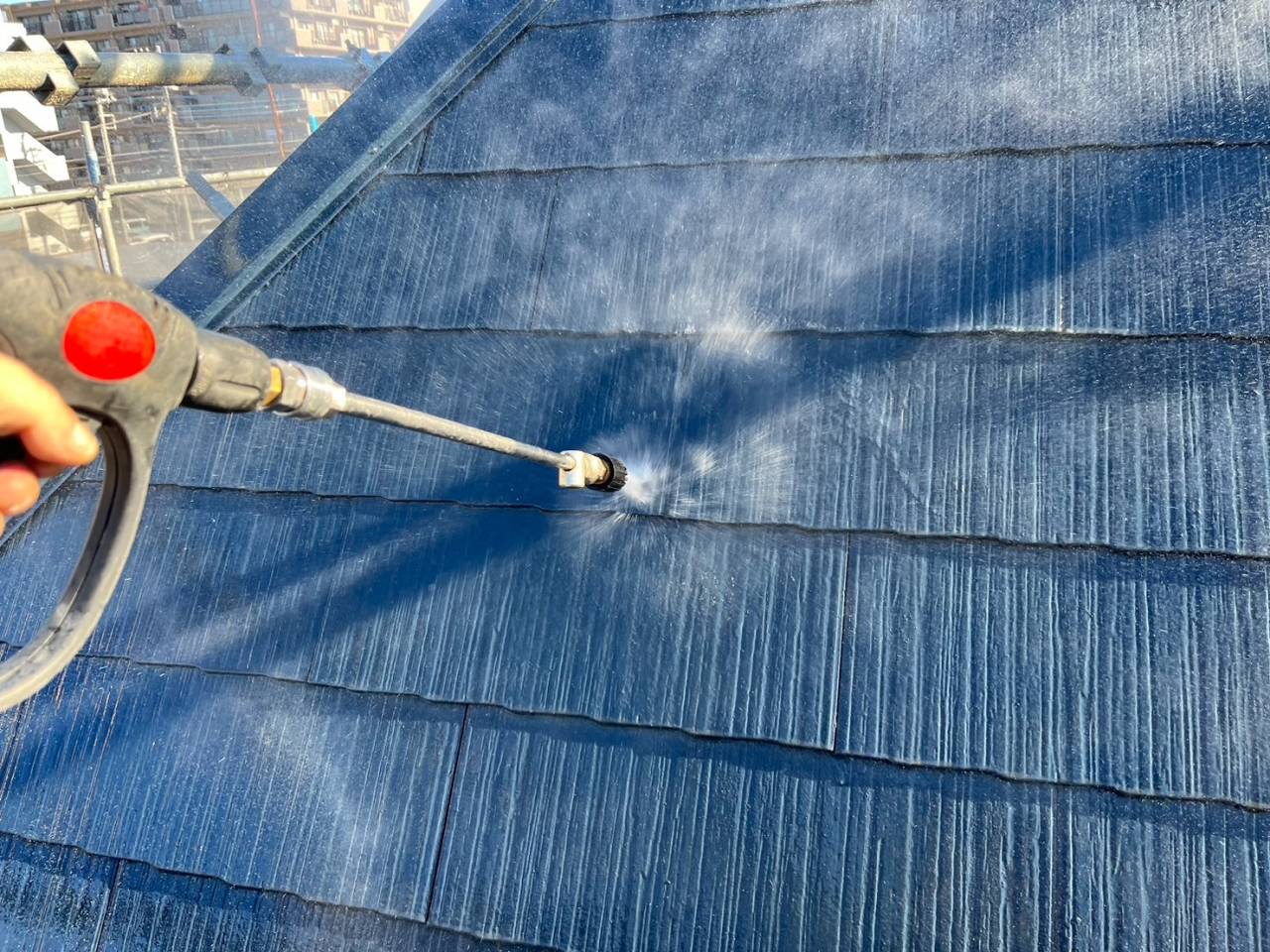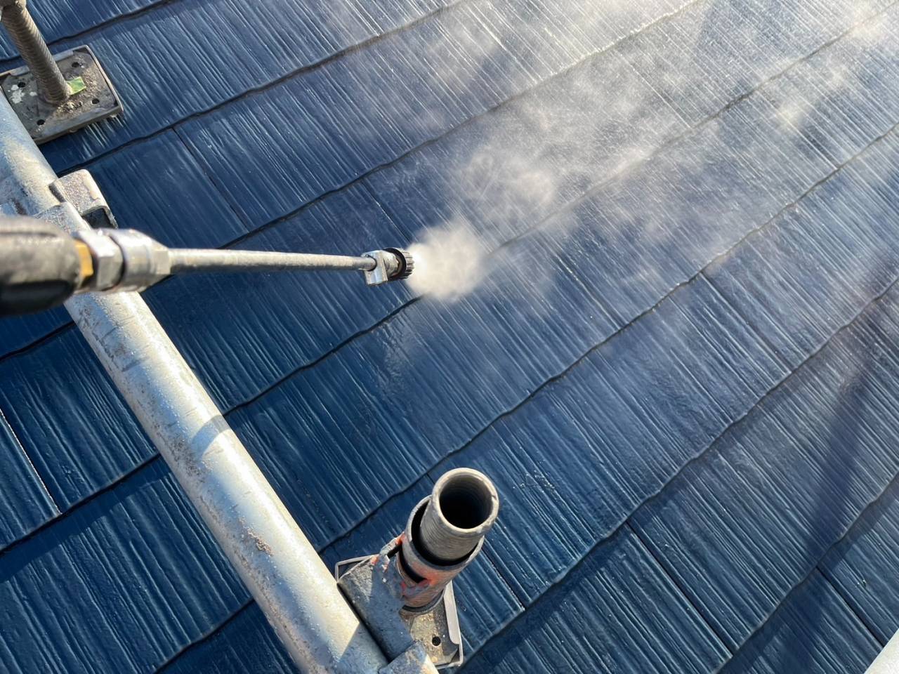 本日は業務用高圧洗浄機を使用し、外壁・屋根の汚れやカビ、チョーキングの粉をしっかりと洗い流しました。