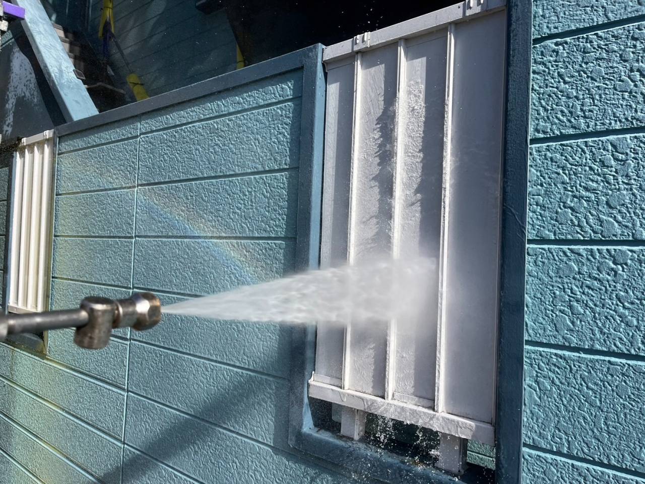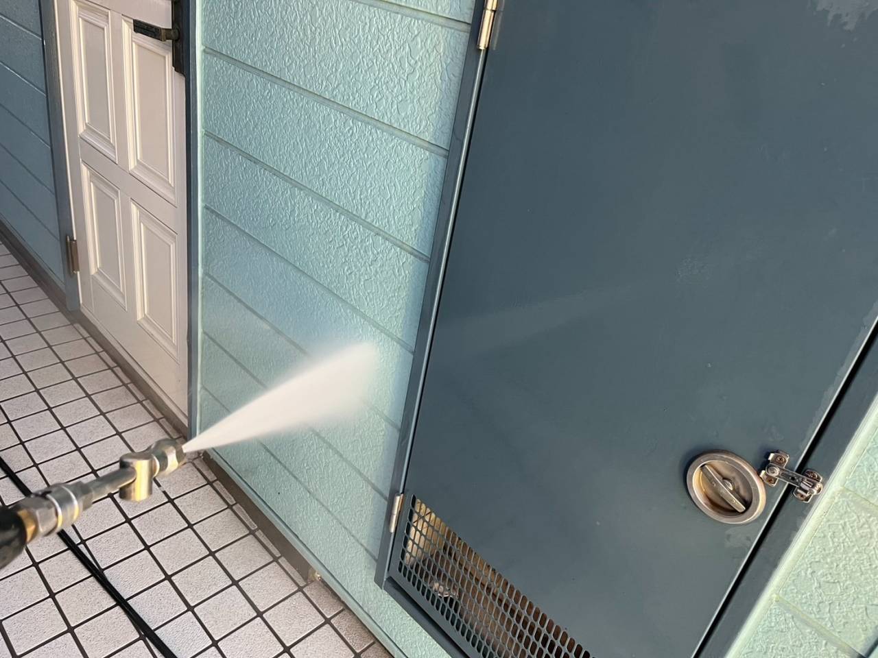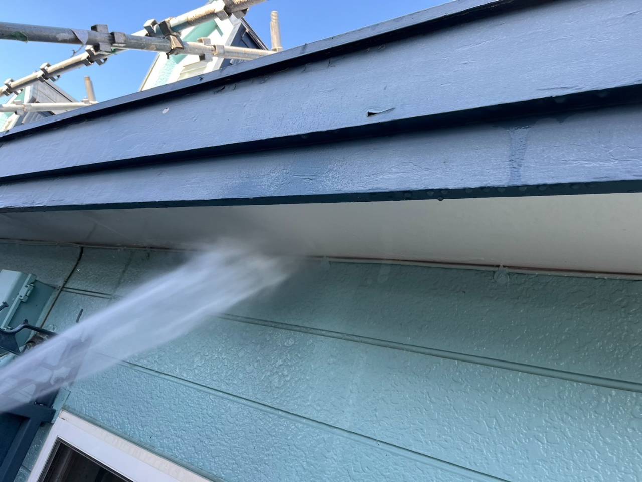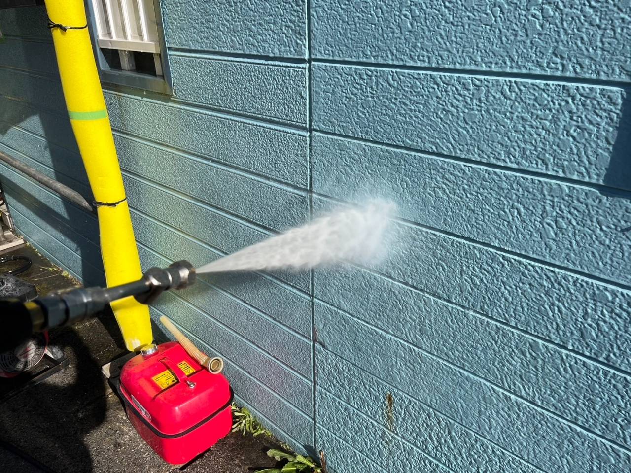 本日は業務用高圧洗浄機を使用し、外壁・屋根の汚れやカビ、チョーキングの粉をしっかりと洗い流しました。