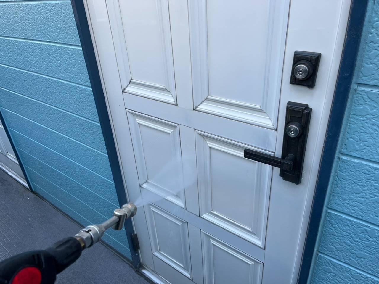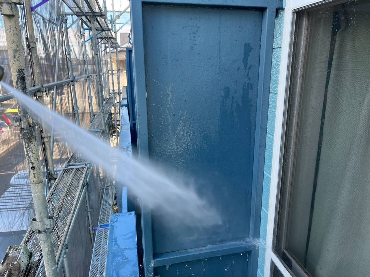 海老名市のY様O・R集合住宅、外装リフレッシュ工事、本日の作業内容は高圧水洗浄です。