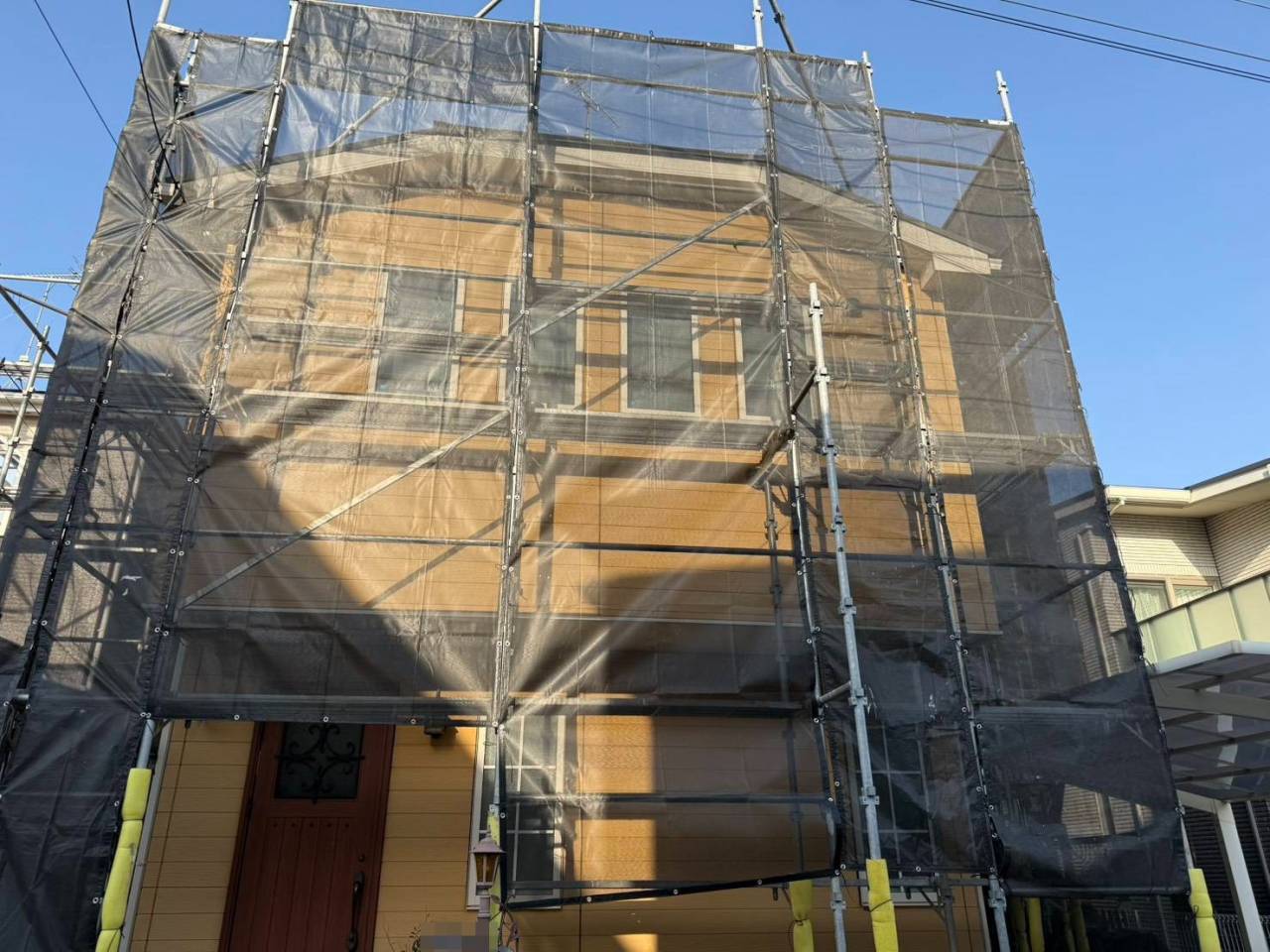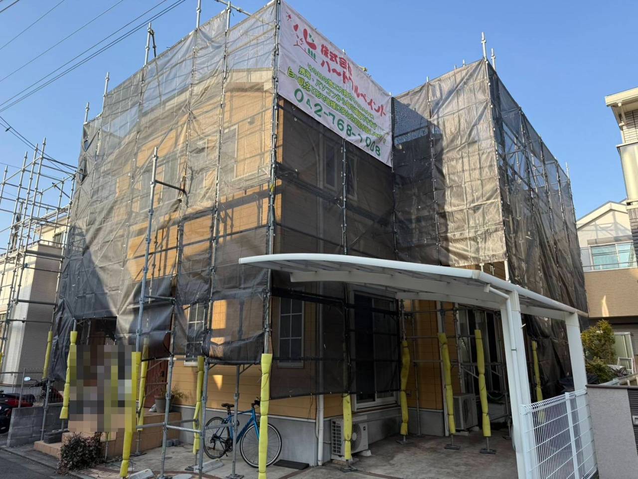 相模原市のN様邸、外壁塗装・屋根塗装工事、本日の作業内容は足場の組立です。