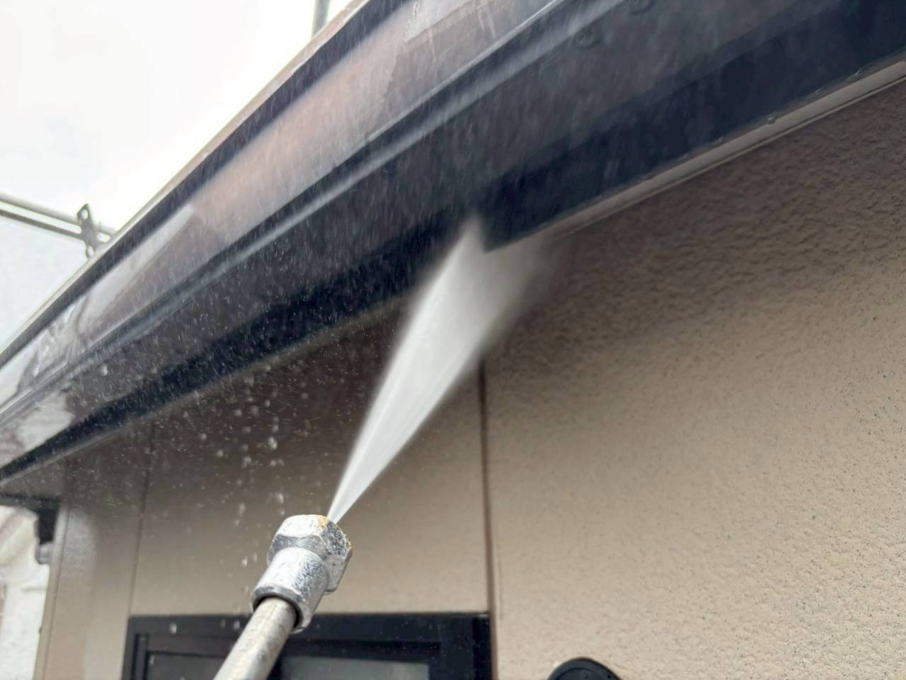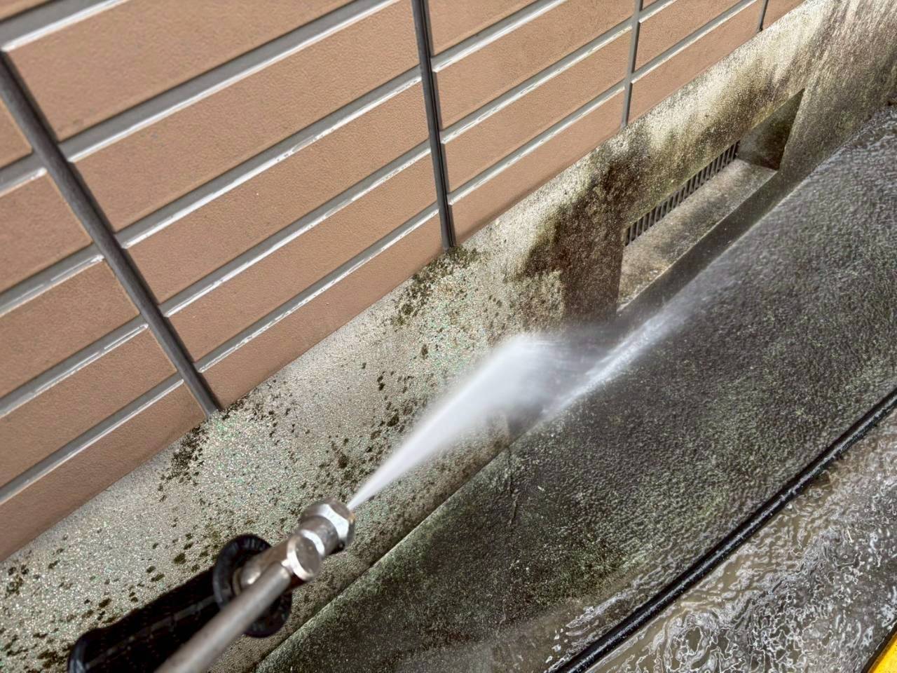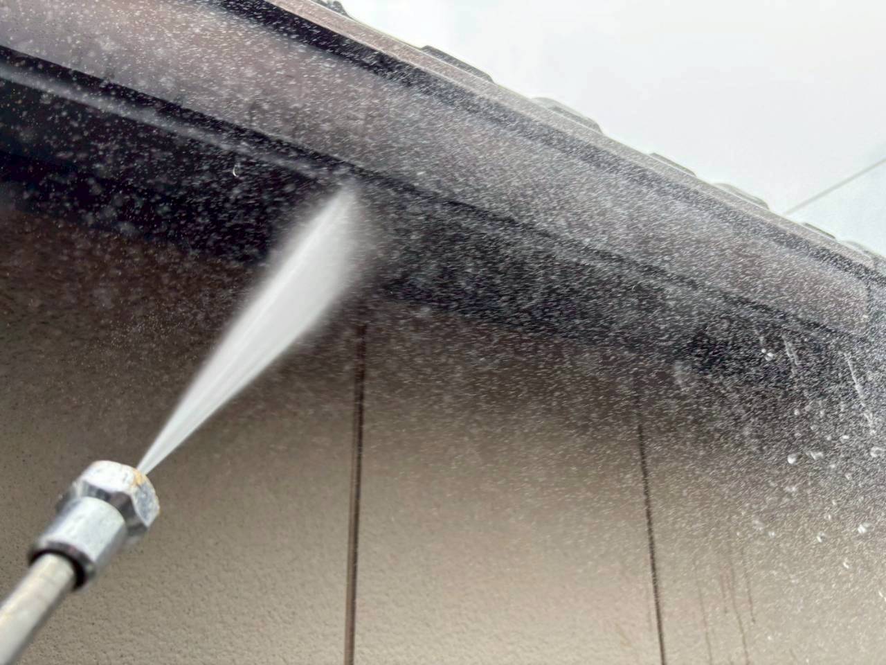 本日は業務用高圧洗浄機を使用し、外壁・屋根の汚れやカビ、チョーキングの粉をしっかりと洗い流しました。
