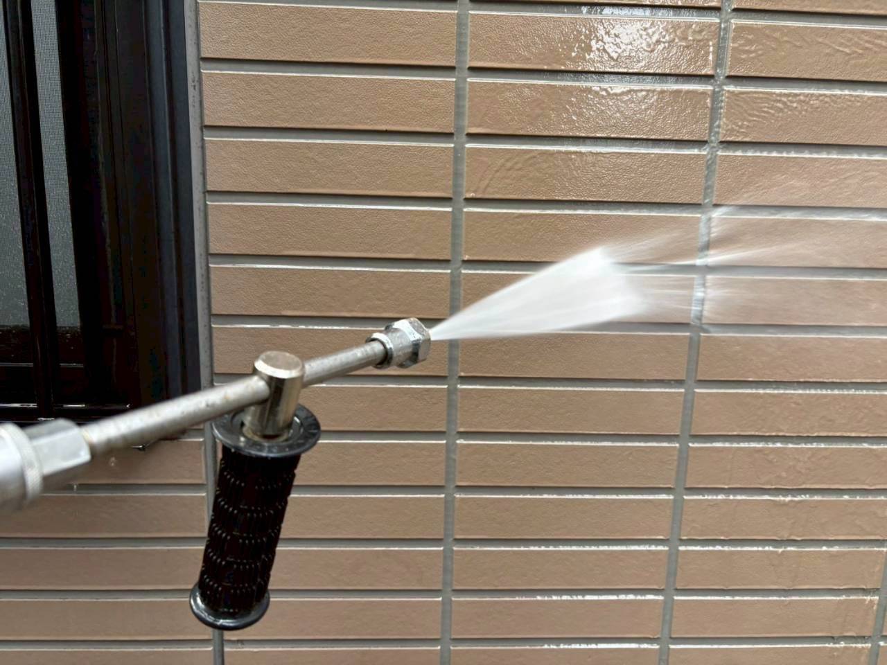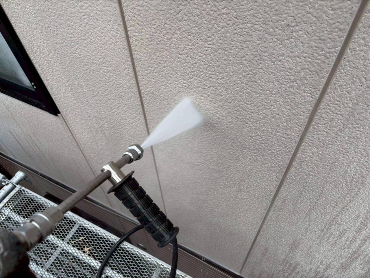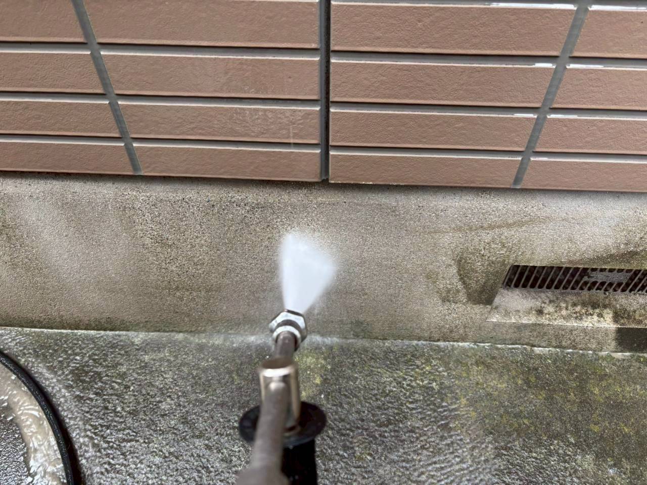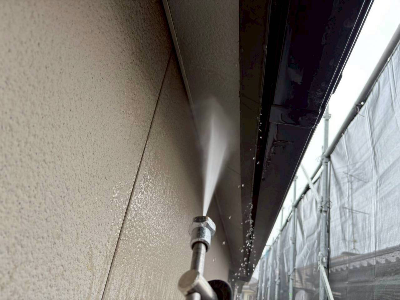 本日は業務用高圧洗浄機を使用し、外壁・屋根の汚れやカビ、チョーキングの粉をしっかりと洗い流しました。