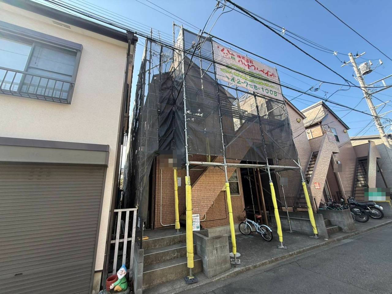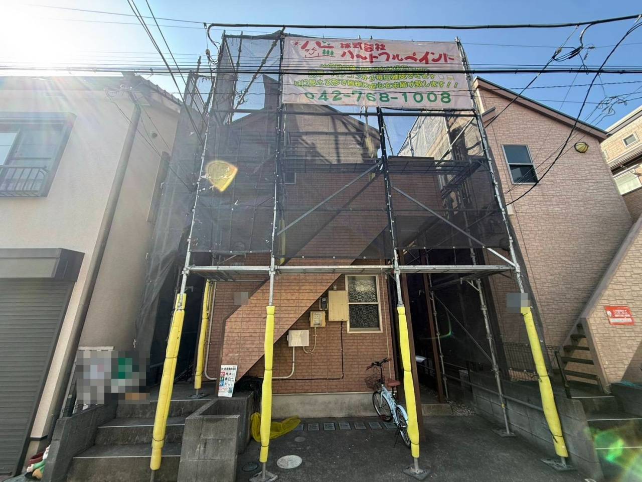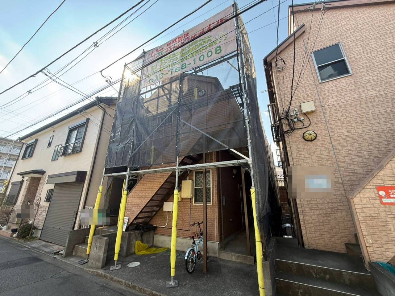 相模原市のY様ALS集合住宅、外壁シーリング工事、昨日の作業内容は足場の組立です。