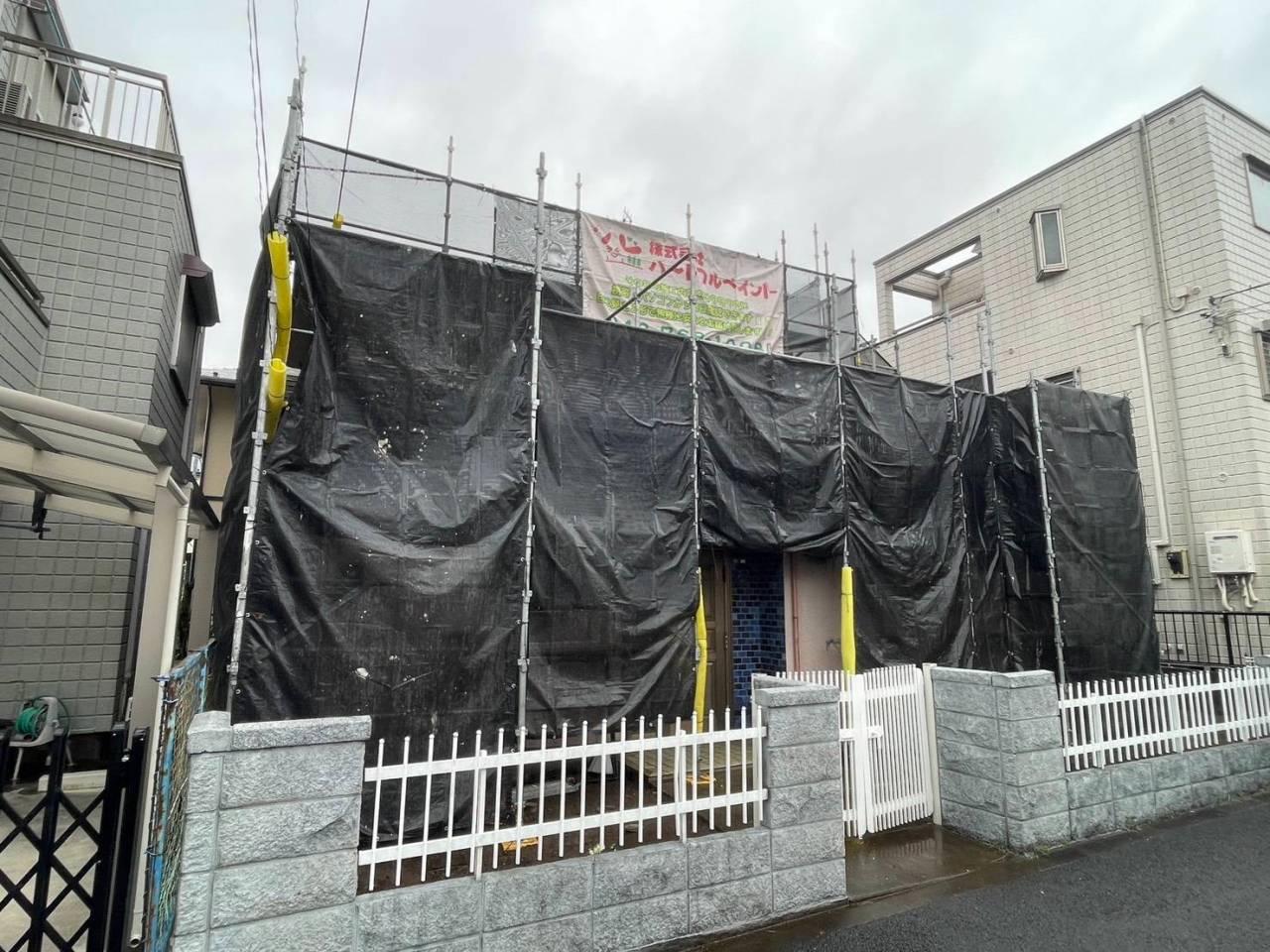 相模原市のF様邸、外壁塗装・屋根塗装工事、本日の作業内容は足場の組立です。