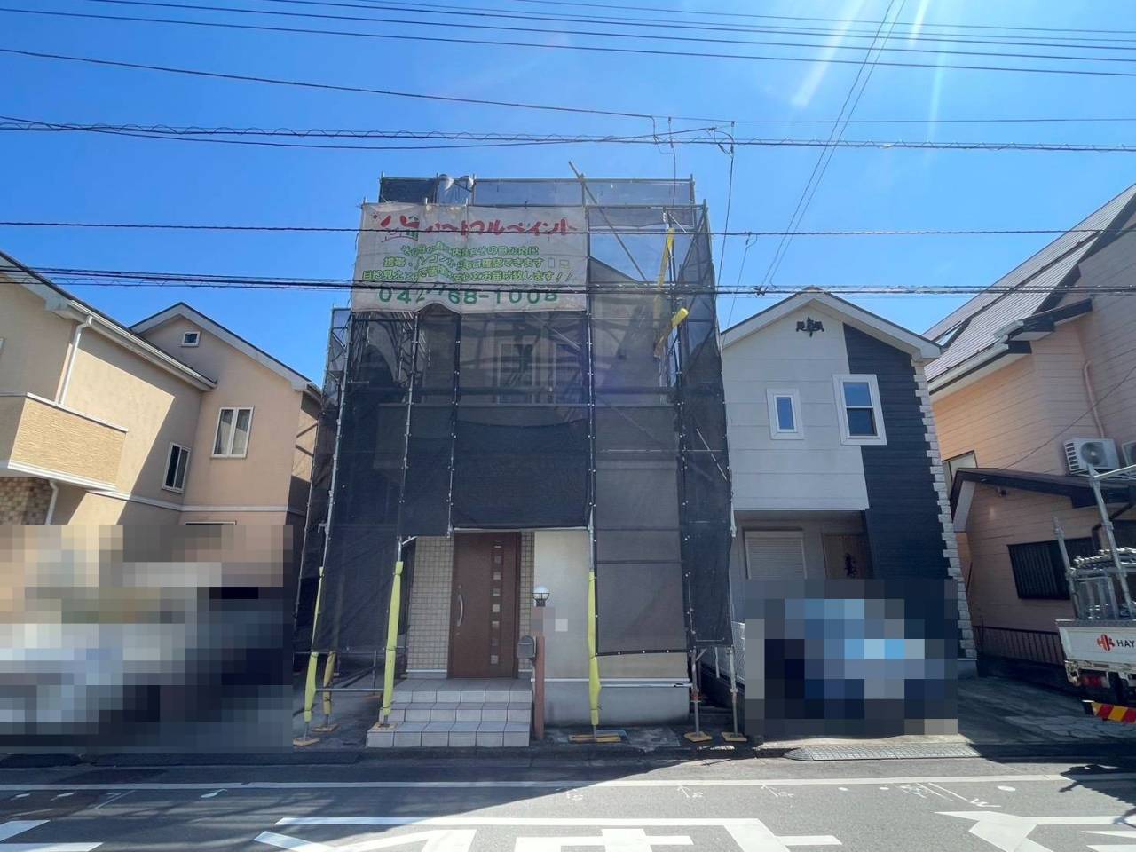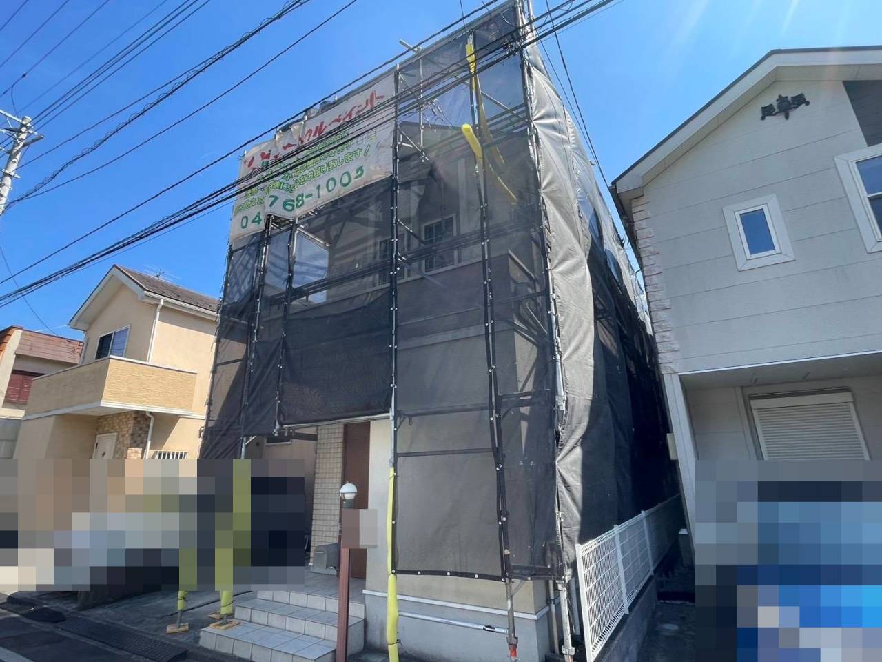 相模原市のE様邸、外壁塗装・屋根塗装工事、本日の作業内容は足場の組立です。